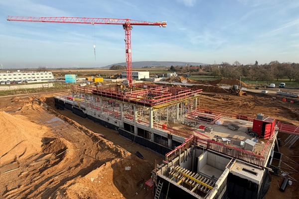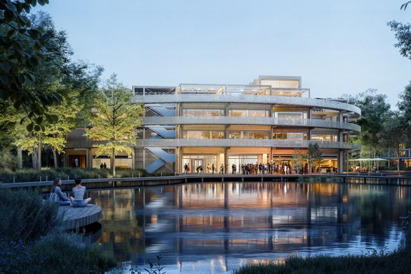 In Jülich entsteht mit dem „Brainergy Hub“ das zentrale Innovationsund Gründerzentrum des Brainergy Parks – ein kreisförmiges Gebäude für die Zukunftsthemen Energie, Digitalisierung und Bioökonomie. Der viergeschossige Neubau mit anteiligem Untergeschoss vereint öffentliche Nutzungen im Erdgeschoss, Büro- und Projektflächen in den oberen Geschossen sowie einen Eventbereich mit Dachterrasse im Dachgeschoss. Das Dach wird begrünt und mit einer aufgeständerten Photovoltaikanlage ausgestattet. Die Bauausführung umfasst eine komplexe Holz-Beton-Stahl-Hybridstruktur mit Holzstützen, HBV-Decken, einem Stahlbetonkern und Stahlbauelementen. Die komplexen Schnittstellen – von Rohbau, Holzbau und Stahlbau bis hin zur TGA, den Fassaden, einem künstlichen See und einer ETFE-Linse – stellen spannende Herausforderungen dar. Das Untergeschoss wird als „Schwarze Wanne“ ausgeführt, die Fundamente erhalten Vouten. Besondere Anforderungen bestehen hinsichtlich Maßhaltigkeit und Sichtbetonqualität. Ziel ist eine DGNB-Zertifizierung in Gold. Visualisierung: HENN GmbH
