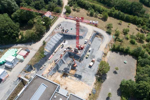 Das Areal des Schulzentrums in Schonungen wird um einen Neubau der Grundschule erweitert. Der Neubau, bestehend aus zwei Bauteilen A und B, wird als winkelförmiger Baukörper errichtet. Im Bauteil A sind eine Pausenhalle, ein Lehrerzimmer, die Verwaltung sowie Räume der offenen Ganztagsschule geplant. Im Bauteil B werden 12 Klassen- und 6 Gruppenräume untergebracht. Die Decken und Wände werden dabei als Sichtbeton (SB 2 und SB 3) errichtet. Das Gebäude stellt einen Massivbau mit tragenden Stahlbetondecken sowie Außen- und Innenwänden in Stahlbetonausführung dar. Während des gesamten Projektes sollen die Arbeiten den Schulbetrieb so wenig wie möglich beeinträchtigen, wodurch der Baubetrieb an einigen Tagen ruhen wird.
